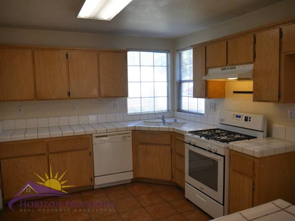 The kitchen has tile floor, oak cabinets, tile counters and a pantry, and is equipped with gas range with: