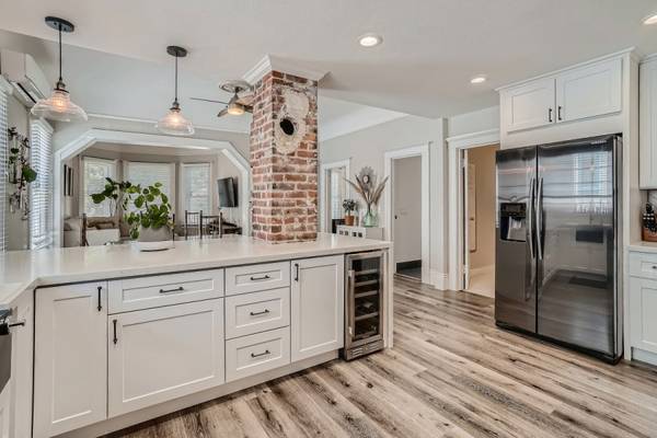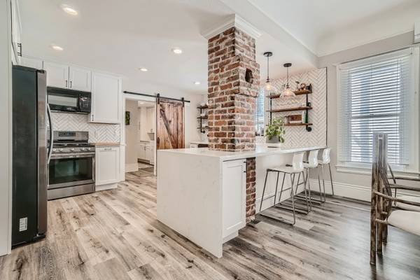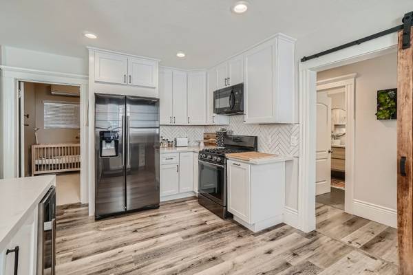 -Stunningly remodeled kitchen with subway tile backsplash and quartz countertops, open floating shelving and large farmhouse sink with touch technology faucet