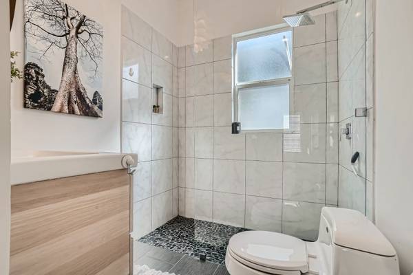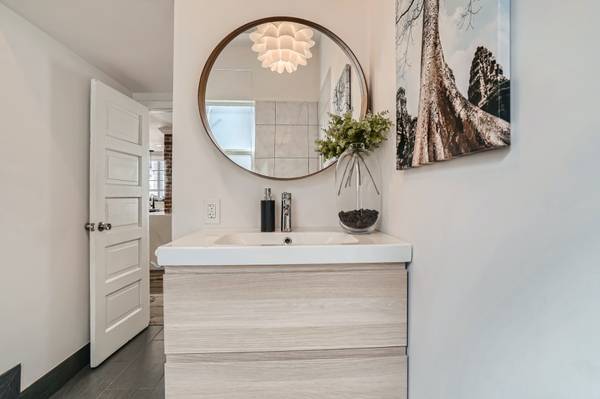 -Modern bathrooms with floating glass shower walls and updated vanities and tile work