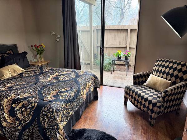 One bedroom has a queen bed with brand new bedding, dresser, large chair, sliding glass door and patio.
