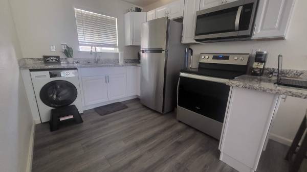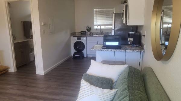 Furnished small 340 Sq ft private, secured unit with a spacious feeling. Electric, gas, water, garbage, high speed internet and LG smart TV included. Inside washer/dryer, stove, refer, keurig coffee maker, air fryer, pots/pans/dishes/ silverware/glass ware, linens, towels and much more. Large private patio w/outside furniture.