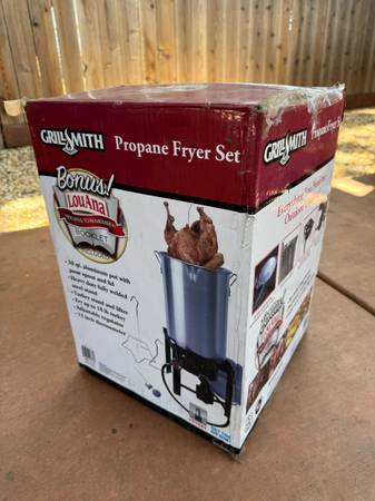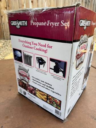 GrillSmith 30 Qt. Propane Turkey Fryer Set Brand New in box 38,000 BTU burner Heavy duty aluminum Heavy duty steel stand Flame senor automatic shut off Timer control Pick up