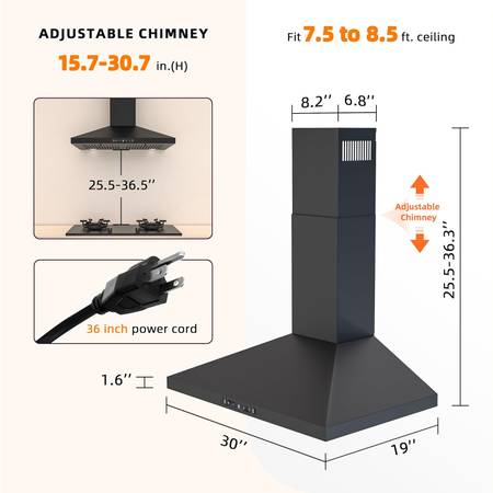 PRODUCT DIMENSION: Vent hood Dimension is 30 in.(W) x 19 in.(D) x Adjustable 25.5 in. - 36.3 in.(H), it is fit 7.5 to 8.5 Ft. ceiling.If you have a high ceiling, add extra extension chimney (Model: FGS-TD24B-ZST) which can extend 9-10 ft. ceiling. In addition, professional and friendly customer service is always online, so please contact us promptly with any questions arise