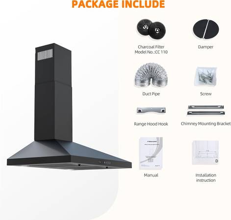 STYLISH APPEARANCE & EASY INSTALLATION: The wall mount range hood is made of 430 grade black painted stainless steel that resists stains and corrosion. It can be adapted to a wide range of modern kitchens.We provide installation instruction, installation manual and installation video to help you install