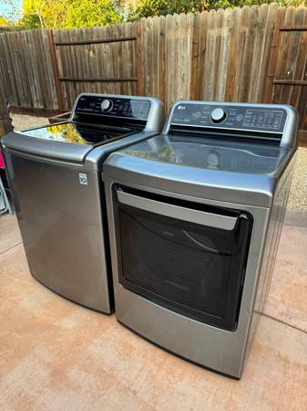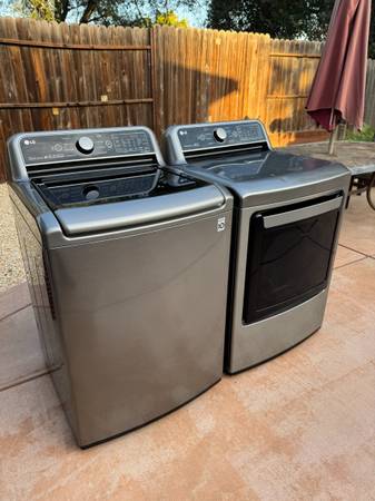 LG Smart Wi-Fi Top Load Washer and Dryer Mfg. Date: 2023 Graphite steel 5.0 cu. ft. washer Minor crack on top lid(see pic) 7.3 cu. ft. electric dryer Energy Star certified Excellent working...