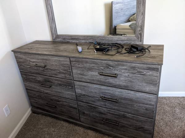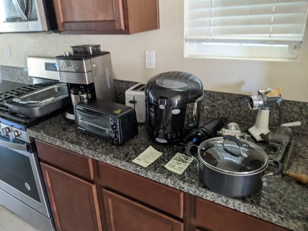Refrigerator $500, Stove $450, Microwave $200, countertop appliances all like new 1.5 years old, bedroom set