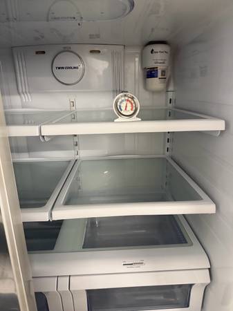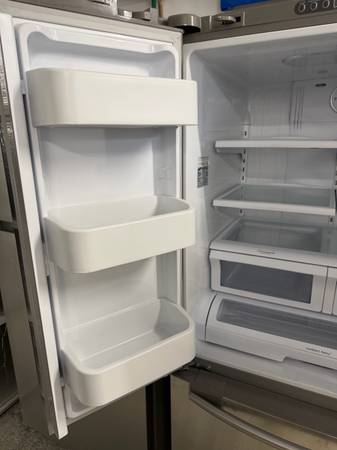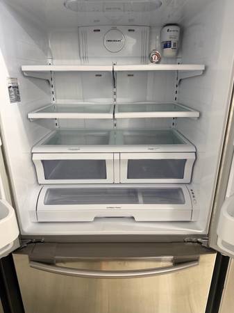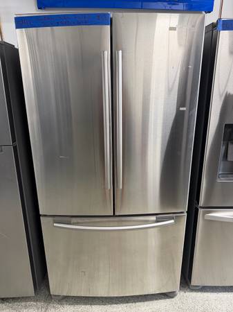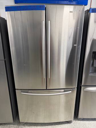 Stainless front door refrigerator very good condition. Very clean works well. Has icemaker in the freezer. No water has a brand new water filter size is 36 inches wide by 34 inches deep by 69 inches tall can deliver for a fee. Come with a 30 day warranty no refund