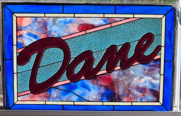 This Beautiful Custom Hand Crafted "Dane" Stain Glass window by 1970's Sacramento CA. Artist Michael Barton features his colorful and intricate handmade design made from repurposed window glass from churches. The vibrant hues and detailed work showcase Artist's Michael Bartons talent in creating this stunning custom "Dane" stained-glass window. Perfect for adding a pop of color and artistic flair to any space. Was previously installed in a door but can also be set in a window, or windowsill. Measures approximately 23 1/2 X 16 X 1/4