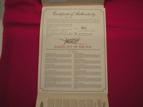 Framed Limited Edition Lithograph, "EAGLES OUT OF THE SUN" SIGNED & NUMBERED 573/1250 With COA. Signed by Twelve Luftwaffe Fighter Aces. Print 21.5 X 31.5. Frame 36.5 X 55.5. Excellent Condition.