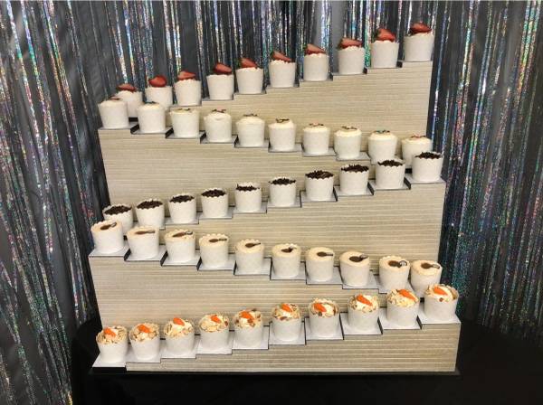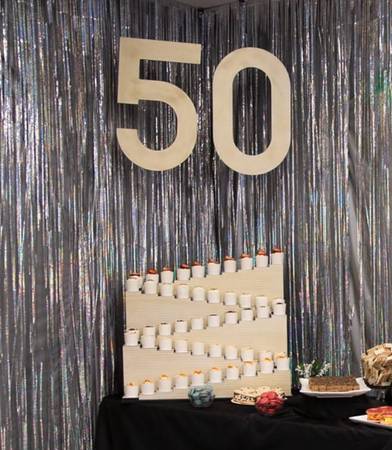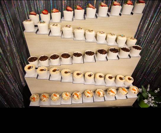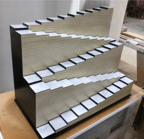I made this unique cupcake display for my wife’s 50th Birthday, I used it only once. Every step is 3 1/4 x 3 1/4 x 50 ea(one for each year). You can put a 3” cupcake on each step. The colors are Gold, Silver and Black. This piece can be used for birthdays or anniversaries. It is good for anyone that celebrates 50th birthday, 50th anniversary or 50 years in business. Any designer or event planner will like this and you can even rent it to your events. If you’re interested email me