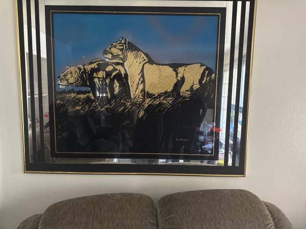 Glass Art decoration with lions. This beautiful picture is framed with gold and has black shimmering glitter underneath the glass strips which highlight the whole piece. Was selling for $1000 obo…but $888 at the moment , so get it now….This is a “CASH ONLY”, no exceptions. You must have transportation to pick up. I dont do delivery’s. You must pick up and please text “Wall Art”. , I’ll let you know if it’s still available and it is first come first serve.
