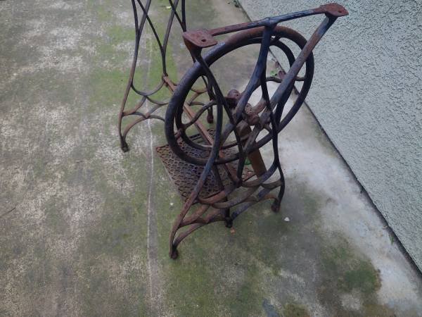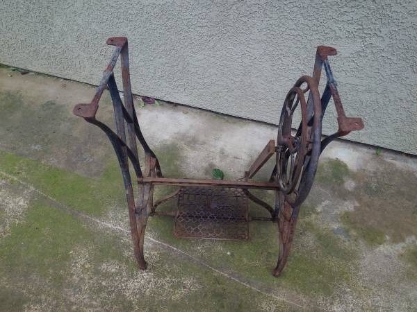 Vintage Union Sewing Machine Base Stand for $100. It has surface rust as pictured. The wheel spins, but does need to be cleaned and greased. Measures about 21"x 16"Dx 27.5"H.