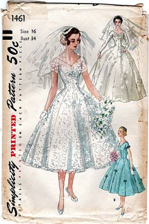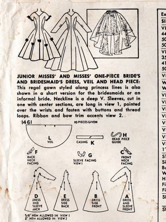 One-Piece Bride's and Bridesmaid's Dress, Veil and Head-Piece: This regal Gown styled along princess lines is also shown in a short version for the bridesmaids or an informal bride. Neckline is a deep V. Sleeves, cut in one with center sections, are long in view 1, pointed over the wrists and fasten with buttons and thread loops. Ribbon and bow trim accents view 2.