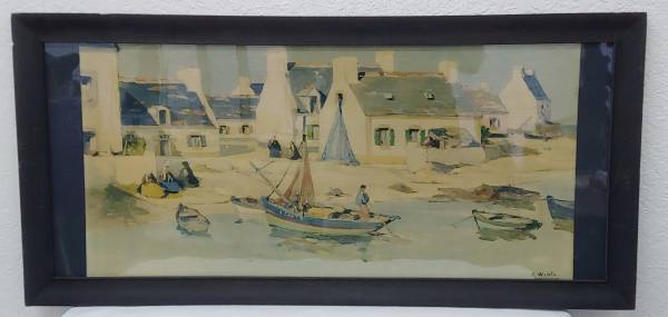 This painting overlooks a busy harbor, three ladies engaging in an activity on the sanded edge of the port, while a man takes his boat out, like many of Wintz’s paintings he depicts the small blue cottages, boats dotted by the port and a warm seaside feel with activity either from the sea or the people.