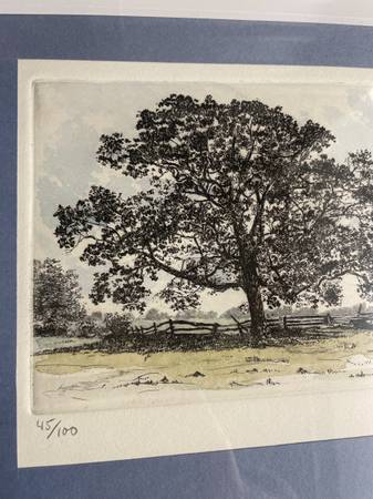 The artwork is a landscape print featuring a large tree and a weathered barn. The number "45/100" on the bottom left of the print indicates that it is the 45th print in an edition of 100.