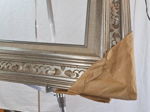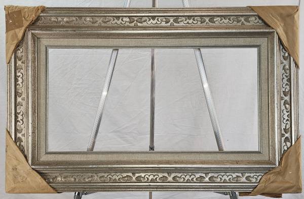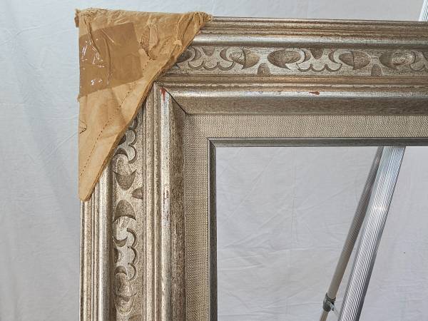 Beautiful vintage pewter colored silvertone carved solid wood frame with beige linen liner. Appears to be unused with paper corner protectors still on. Some minor imperfections to be expected with a vintage item, but overall, it is in excellent condition and just waiting for your treasured work of art to be showcased in it! Marked $150.