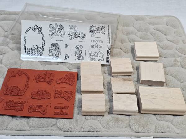 This retired set of wooden rubber stamps includes festive-themed basket filled images including a basket, Christmas, Easter, Autumn, Sewing, text, making it ideal for a variety of crafts and cards. Versatile wood-mounted rubber stamps ideal for crafts, scrapbooking, and DIY projects. High-quality designs ensure sharp and detailed impressions. Labels and stamps are still uncut and unmounted. Storage case included. Stamps - NEW condition!