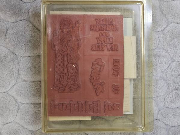 This retired set of wooden rubber stamps includes folk art Christmas-themed images including a Santa, pine bough garland, To:, From:, greeting, and inscription, making it ideal for a variety of Christmas crafts and cards. Versatile wood-mounted rubber stamps ideal for crafts, scrapbooking, and DIY projects. High-quality designs ensure sharp and detailed impressions. Labels and stamps are still uncut and unmounted. Storage case is yellowed. Stamps - NEW condition!