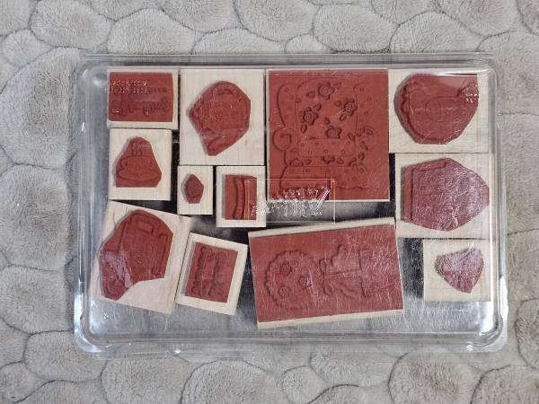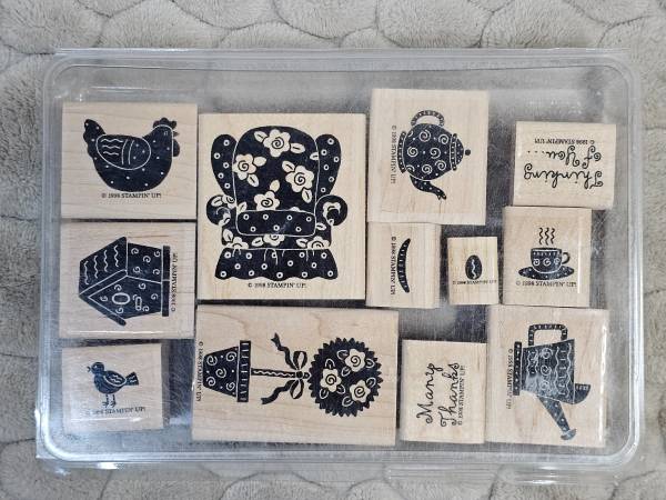 This retired set of wooden rubber stamps includes decorative-themed images including a teapot, teacup, watering can, birdhouse, heart, bird, topiary, chicken, and an overstuffed chair. High-quality designs ensure sharp and detailed impressions, making these versatile wood-mounted rubber stamps ideal for a variety of crafts, scrapbooking, cards, and DIY projects. Storage case. Stamps appear to be unused.