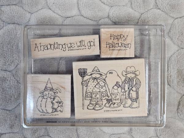 This retired set of wooden rubber stamps includes Halloween-themed images including pumpkin with cat, Trick or Treaters - witch, ghost, cowboy, two text stamps, making them ideal for a variety of crafts, cards, scrapbooking, and DIY projects.. High-quality designs ensure sharp and detailed impressions. Storage case. Stamps are in excellent used condition.