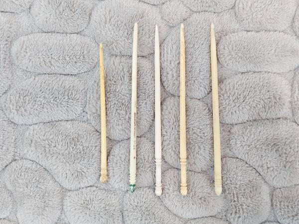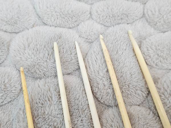 Lot of 5 vintage bone crochet hooks - 1 is marked Susan Bates. Each hook is designed for crocheting and is made with bone material, giving them a unique and classic look. Perfect for crafters looking to add a touch of vintage charm to their projects, these hooks are a must-have for those who enjoy working with traditional tools and materials. SOLD AS A LOT - WILL NOT SEPARATE.