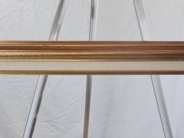 Vintage wood frame - gold bordering a brown strip and accented with a beige linen liner. Minimal imperfections especially for a vintage frame. Overall it's in wonderful condition and waiting to find its new home!