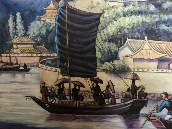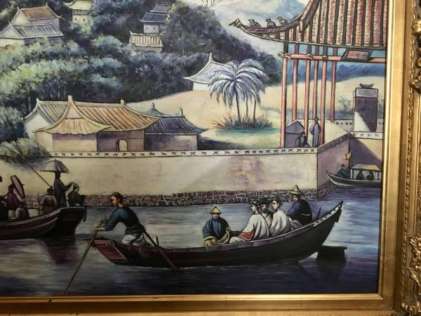 a large, framed oil painting depicting a vibrant Chinese landscape with boats on the water and a village nestled on a hill topped by a prominent pagoda.