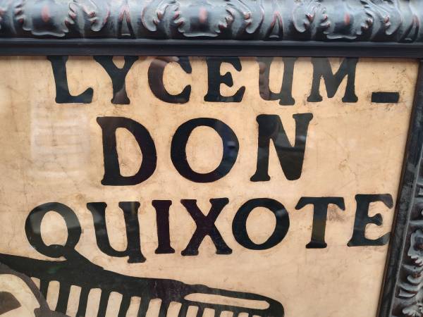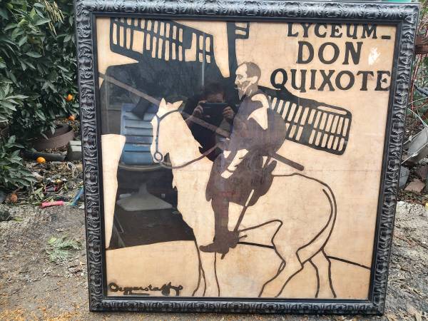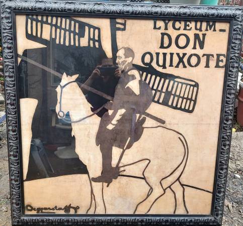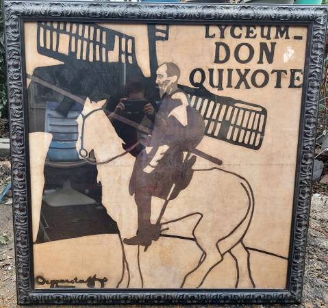 Design Plus Gallery presents a Large Scale Don Quixote Reproduction print by Room & Barrel. The Berggarstaff poster for a play in March of 1897. The Beggarstaffs, under this double pseudonym, Nicholson and Pryde, create the modern woodcut post with clear outlines and large expanses of flat color. Framed with a deep dark frame for impact