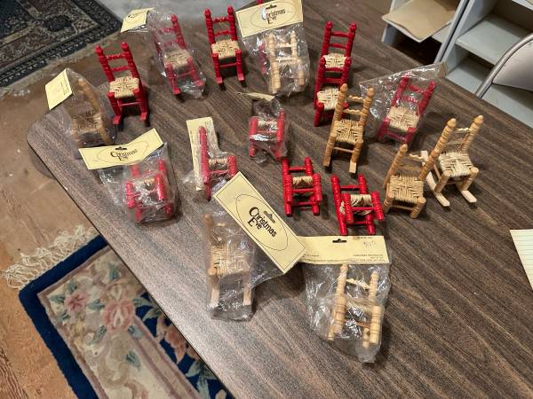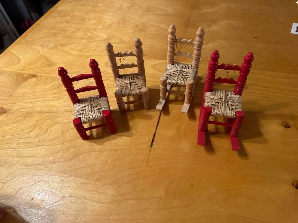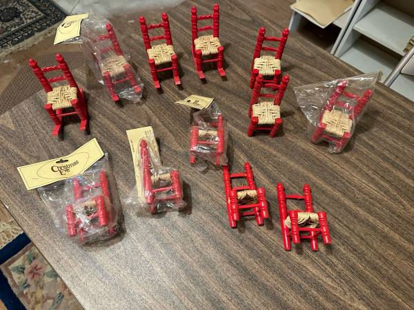 Vintage. Set of 19 miniature chairs by Christmas Eve, red and natural wood colors. Size 5” tall 3” deep. 7 natural colored ( 3 are rockers), 12 red (4 are rockers). Use as ornaments or create your own design with a small elf or doll. The last two photos are ideas for you. I can even sell you the pattern for the adorable mouse who would also like to sit on the red chair. Pattern is $5. *note: (Original price of chairs was $4.50 in the 90's.)