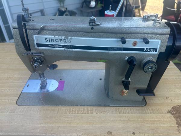 Industrial sewing machine, Clutch motor, zig zag and straight stitch, gooseneck lamp, foot pedal and knee pedal, knee pedal needs to be connected, stitch width 0-5, thread holder, serial #V874705137, cat no. 1910, mounted on 4 ft table, tested, good working condition