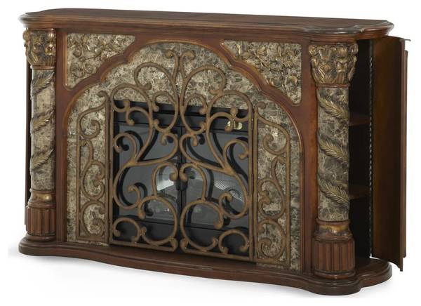 The Villa Valencia Fireplace by AICO Furniture beautifully captures the look & feel of Old World Spain. Beautifully crafted from Birch solids with Cherry Pecan & Elm Burl veneers the distinctive marquetry & intricate embellishments compliment a classic chestnut finish. From its marble relief to the unique multi-faceted beveled glass encasements Villa Valencia Living Room Collection is a timeless collection to be treasured year after year.