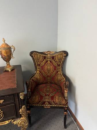 French Napoleon III style chairs, with fabric that tells a tale of timeless elegance. Approximate Measurements in Inches 42" high at back 25" wide 27" deep (back to front) 20" high at seat 19" deep...