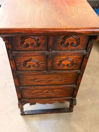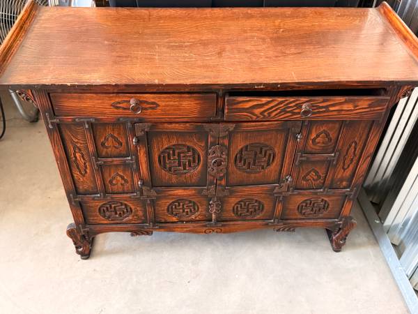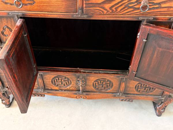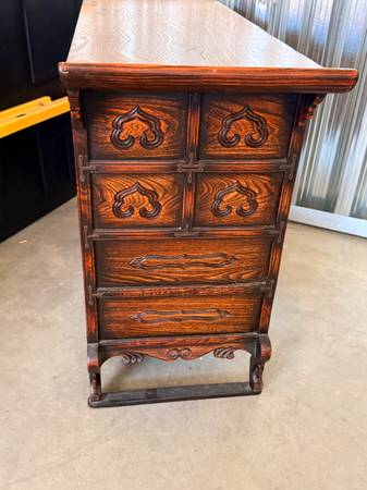 This is an antique Chinese altar cabinet, also known as a "butterfly cabinet" or "Kang" cabinet. These cabinets are often handcrafted in the Ming style, featuring traditional carved feet and straight lines.