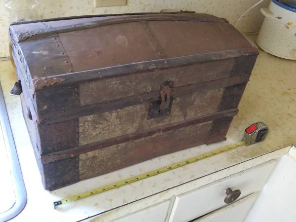 tall. Has the original tray. Missing leather handles but has all the ornate hardware. Good solid condition. Very dirty and needs a good cleanup. $69.00 or make offer. Porch pickup.