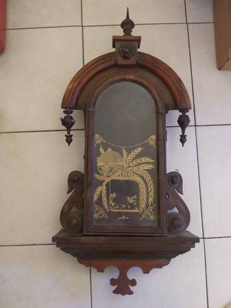 Antique empty Ansonia Habana wall clock case. Missing the movement, face hands and pendulum. Really nice solid case, door and original finials. Glass is a replacement. Measures approximately 25"L x...