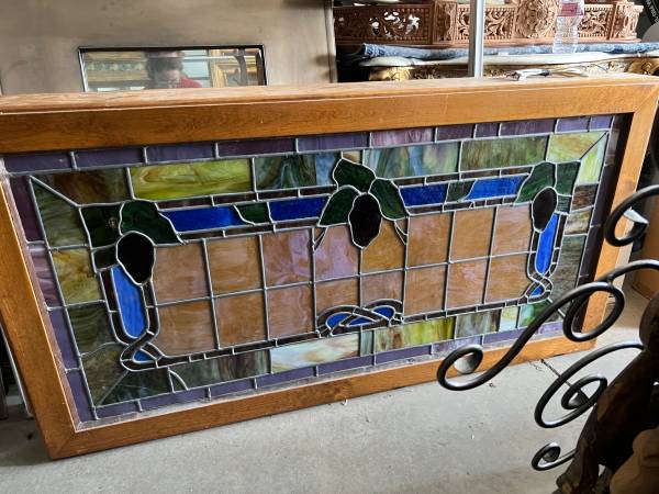 4) Large Antique Stained Glass Window Panel in Wood Light Box with Grape Design - $8,500