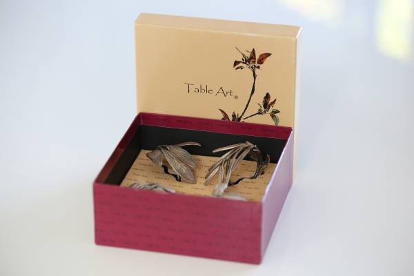 This is a box set of "Italian Herb" napkin rings by Table Art, a brand by artist Michael Michaud. Set of four napkin rings Cast in pewter with an antique brass finish NIB, new never used $118-126 at...