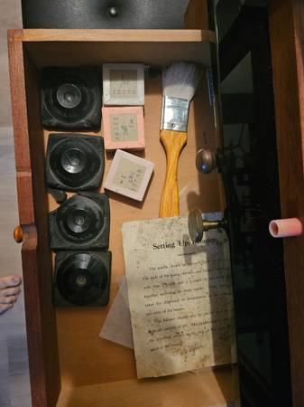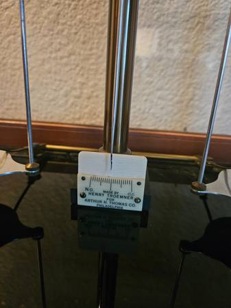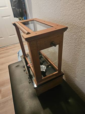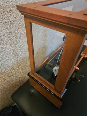 Mid 1900s Henry Troemner #65 Philadelphia cased balance scale. Wood and glass framed with front pull up windows. Scales in tact with weights 18"l x 18"h x 10"d. No chips, cracks. No Shipping...