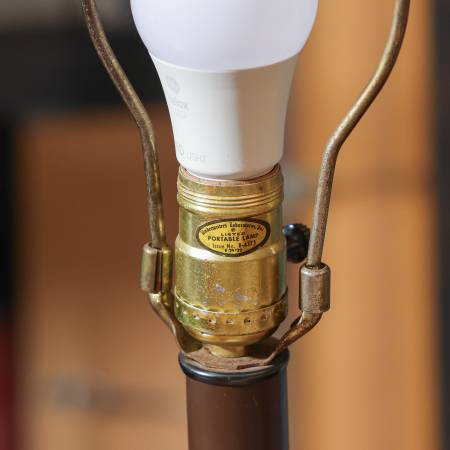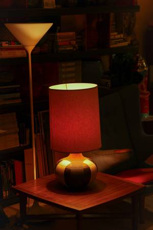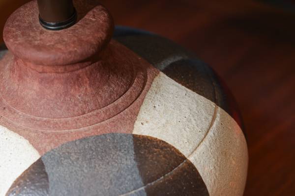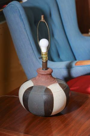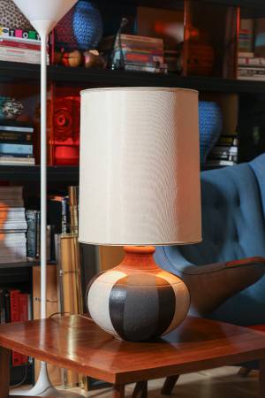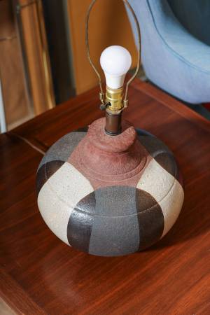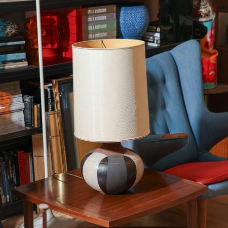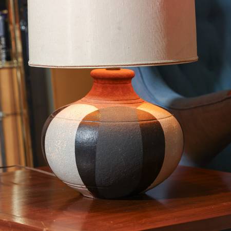 Large-scale studio pottery lamp attributed to the California ceramic movement of the late 1960s to early 1970s. The sculptural stoneware base features stylistic elements found in both David Cressey’s Pro/Artisan Collection for Architectural Pottery and Robert Maxwell’s work for Pottery Craft.