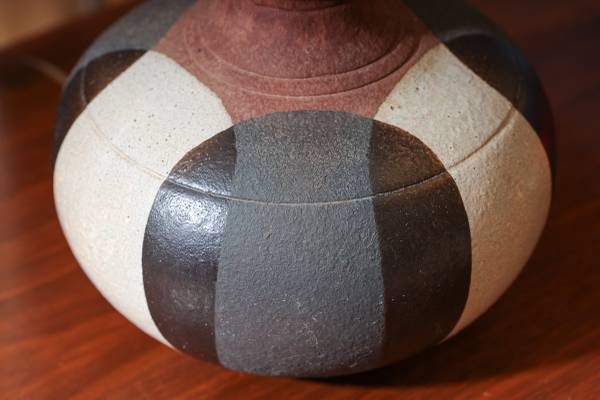 The form is wheel-thrown with hand-incised ring details and a surface design created through multi-angle dipping in iron and manganese oxide glazes. The bold vertical arcs alternate between exposed clay and dark oxide washes, creating a striking contrast and layered depth. While unmarked, the red-brown clay body, scale, and glaze treatment are highly consistent with documented examples from both Cressey and Maxwell studios.