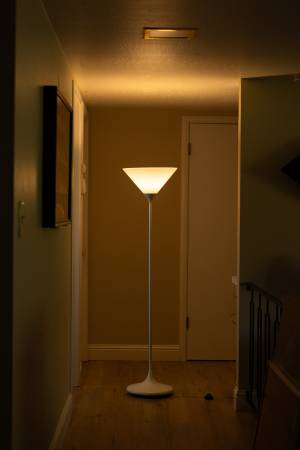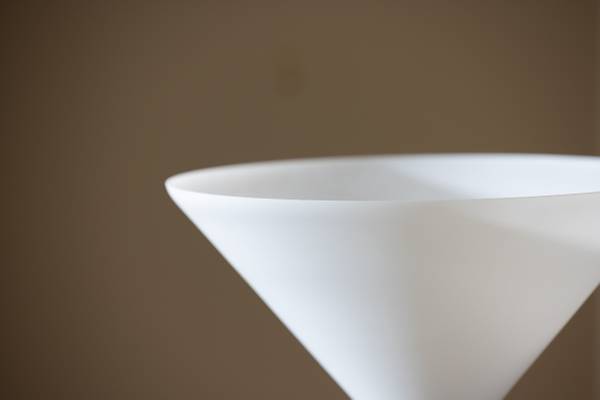 Striking postmodern torchiere lamp by Koch + Lowy with a sculptural tulip-style base and frosted conical glass diffuser. Made in the USA (CAT# 13270-5), this piece is in excellent shape — no chips or cracks on the glass, and very minimal wear on the speckled matte base.