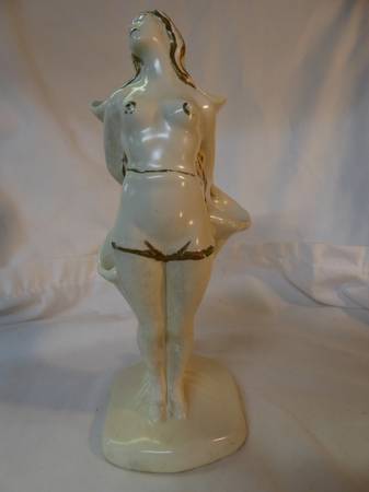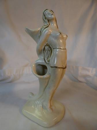 This is a 1941 Metlox Art Nouveau Romanelli Nude Vase. It is ivory in color with gold highlights in the hair and on the body. Made in USA. Design Patent 124149. It stands 9" tall. The base is 3" by 4". There is a very old pinhead size chip along the top rim of the vase. Otherwise, no cracks/chips/damage. $150. It is in Penryn. Call show contact info