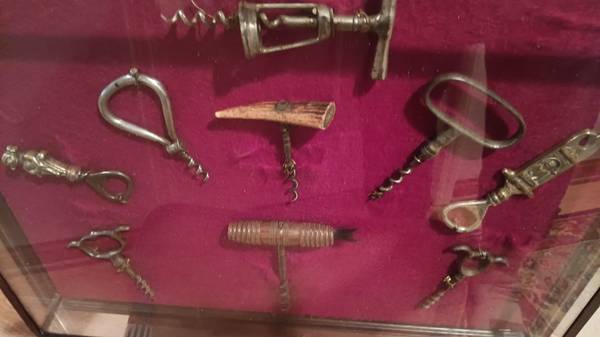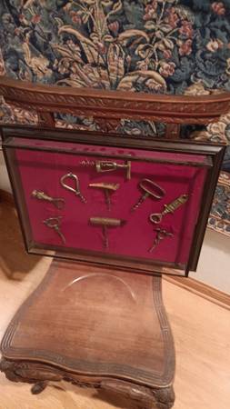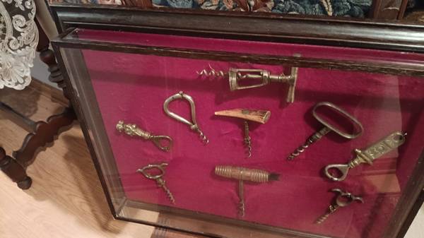 Antique collection of corkscrews. A total of 9 in a glass display case. Items are from the late 1800's to the early 1900's. Several are in the ten dollar range and many are in the twenty to thirty dollar range. The display size is 22 1/2inches long, 17 1/2 inches high, 3 inches wide. Great for man cave or back of the bar display. Porch pick up and cash only. Thank you for looking.