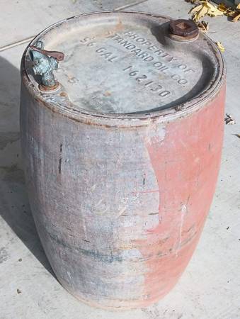 This is a vintage 56-gallon galvanized steel storage drum with an embossed description "PROPERTY OF STANDARD OIL CO." The latest Patent date on it is 1916. It is thick and very heavy. It does have a couple of dings but still in great shape considering its age and purpose. Was $400. Price reduced to $300. Phone calls only as I don't text or email. I am in Red Bluff but am willing to meet buyer in Williams, north off of I-5.