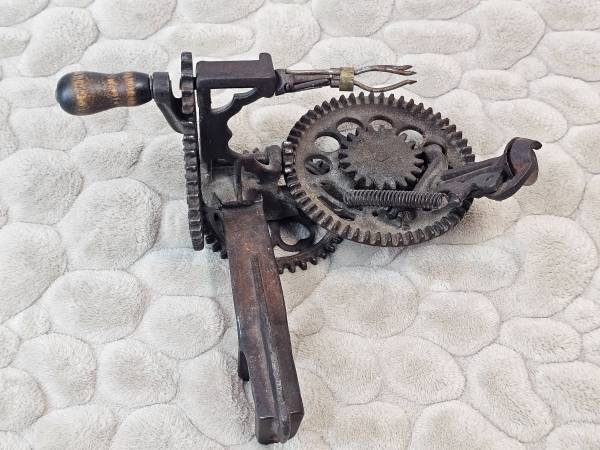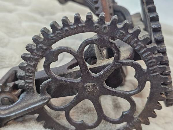 Antique Sinclair Scott Co. Baltimore Apple Peeler. This is an antique mechanical apple peeler made of cast iron in the USA and dates back to the late 1800s. It appears to be in good condition with mild surface rust. Could be cleaned up nicely. Wonderful nostalgic feel of a bygone era! Missing bolt that screws into the bracket to hold to the table/cutting board, but could easily be replaced. Really nice condition for an item of this age.