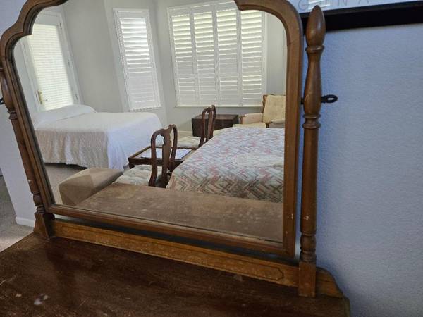 Antique oak dresser with the original beveled swivel mirror. Two small drawers, two large drawers. Beautiful mirror Quality craftsmanship. Price of only 275.00 OBO Dresser is located in Roseville.