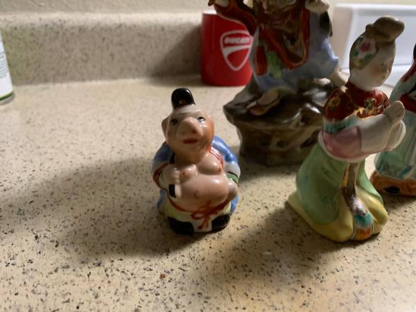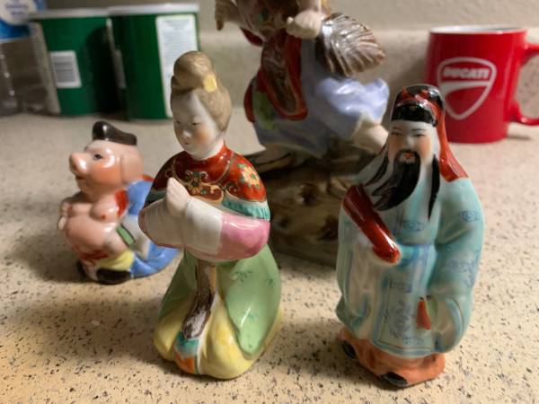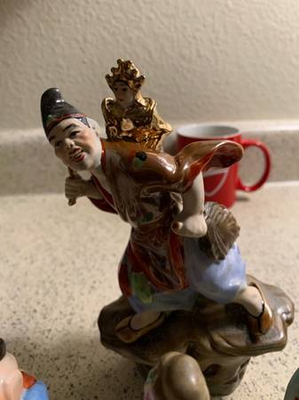 I have 4x Chinese figures 7-3 inches , gold piece has A chip pictured () A Budda /kim wall hanging ( porcelain) plate .. They all are in good shape 60.00 for Set Cash or Zelle will shipp