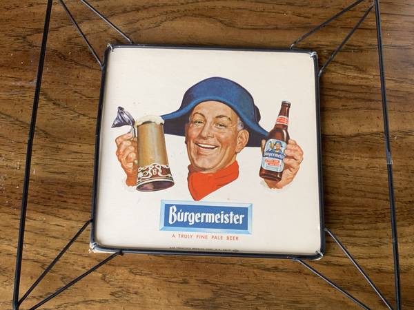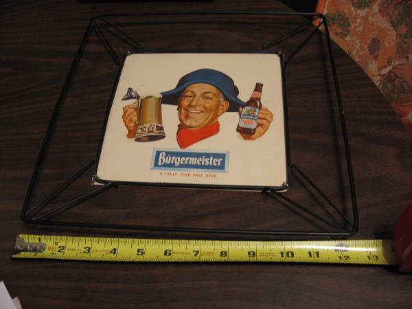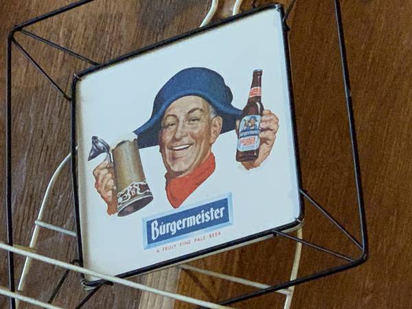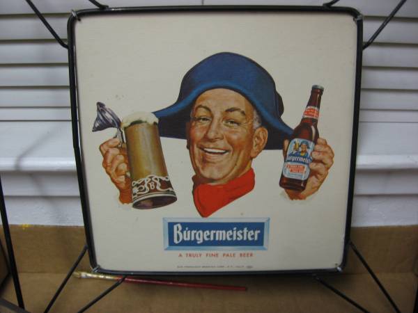 Vintage BURGERMEISTER Beer advertising sign! If you're able to find another it will likely be all dirty and torn, mine is super nice! This a clean unblemished early 1950's advertising Beer sign with great graphics! The frame measures approximately 12" square. The cardstock sign in the center with the Burgermeister Guy is 8" square! I live in the Pocket near Garcia Bend! Price is $60 or best offer! Come check it out if interested, my name is Robert and I live near Garcia Bend Park, best to call or text me as I seldom email. If I don't answer your call, leave me a VM, no VM, I won't call you back, I get too many spam calls. Thanks