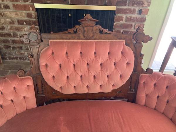 GOOD CONDITION EASTLAKE-TYPE SETTEE/SOFA. PINK/MAUVE PLUSH IN PRETTY GOOD CONDITION. FRAME IN GOOD CONDITION. NO OBVIOUS REPAIRS. 66" LONG, 30" DEEP, 42" TO TOP OF BACK, 17" TO SEAT.