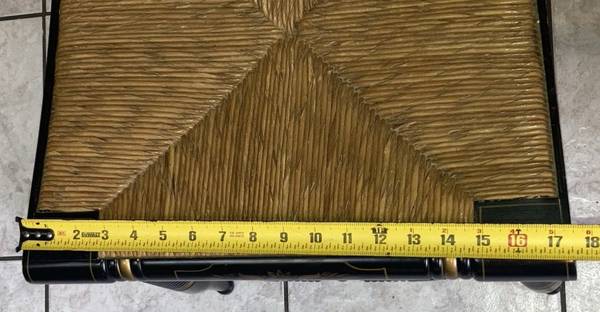 Add a touch of vintage charm to your Vintage Dining Room with a L. Hitchcock accent chair. Crafted from wood and ebony, these chairs feature a beautiful black harvest pattern and gold stenciling. Measuring 17.75" in width and 34" in height, this chair is designed with a comfortable seat depth of 15.25" and seat height of 18.50". The chair is handmade.